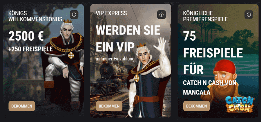 Die Bonus-Aktion „Kings Gift“, also ein Geschenk der Majestät persönlich, gibt es jeden Donnerstag für Bestandskunden. Das ist ein umsatzfreier Cashback Bonus von bis zu 13%. Dieser Casino Bonus ist für Spieler mit VIP-Status erhältlich: